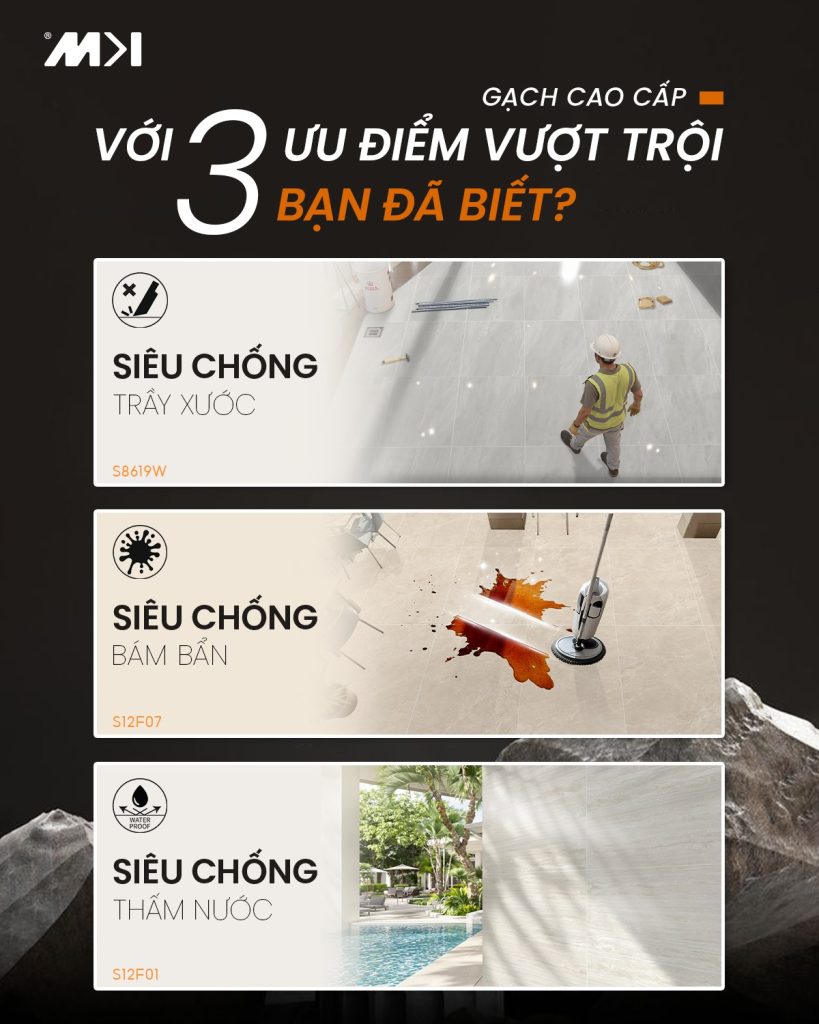 Gạch gần như không thấm nước, không bám bụi và rất dễ lau chùi – giúp giữ không gian luôn như mới theo thời gian.